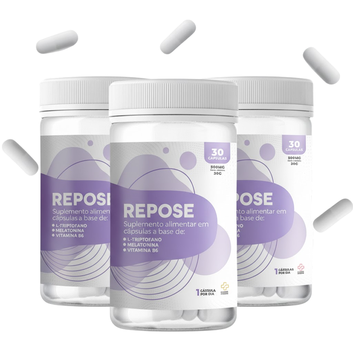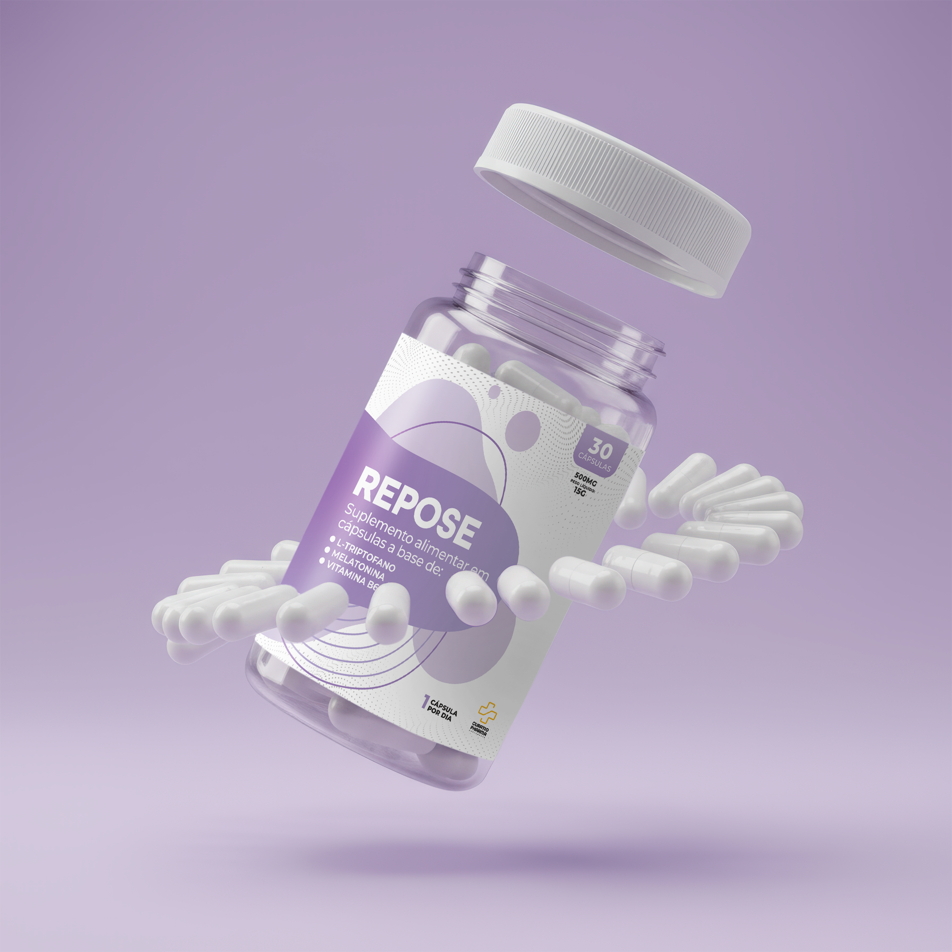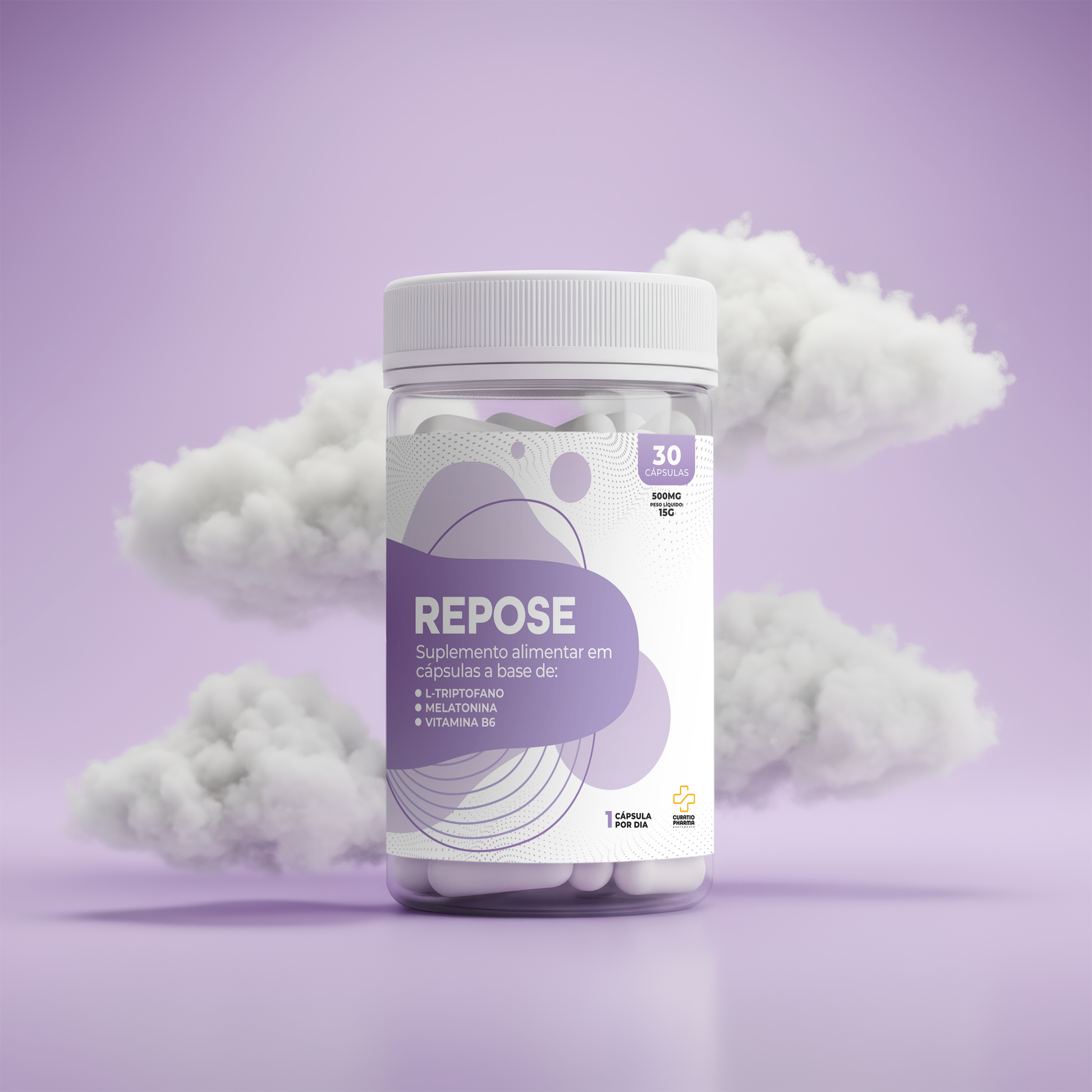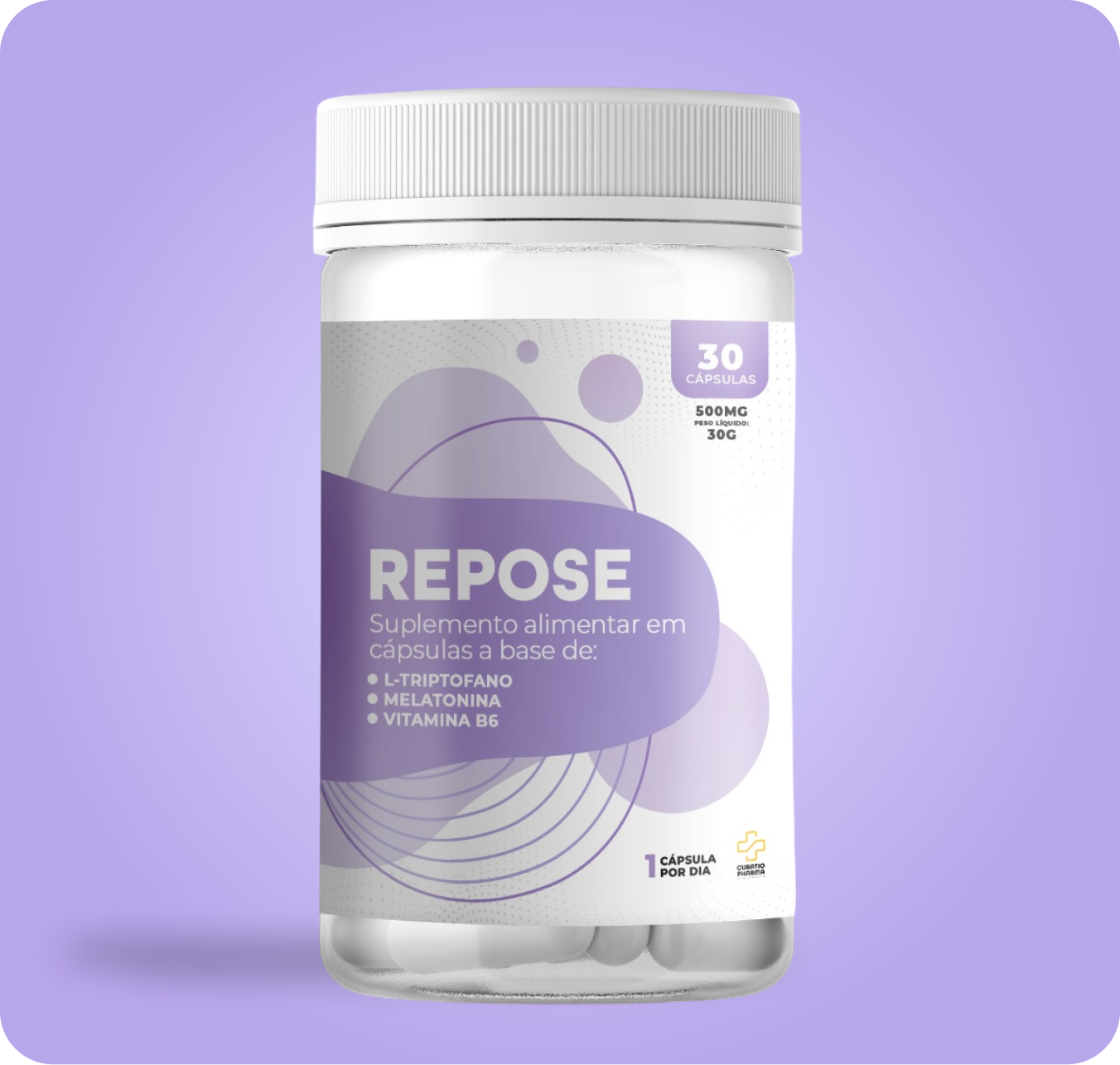 Repose é um suplemento natural desenvolvido para promover relaxamento e restaurar o ciclo natural do sono. Sua fórmula combina L-Triptofano, Melatonina e Vitamina B6, atuando na produção dos hormônios do bem-estar e do sono.